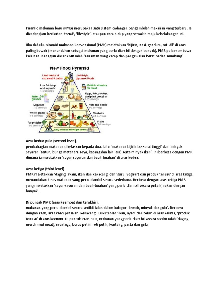 Infografik mengenai piramid makanan, iaitu panduan bagi memilih makanan yang sihat. Makanan ini juga membekalkan vitamin, mineral, serat dan sedikit protein. Makanan ini juga membekalkan vitamin,mineral, serat dan sedikit protein. Aras 1 piramid makanan mengandungi kumpulan makanan yang kaya dengan karbohidrat kompleks, yang merupakan sumber tenaga yang utama. Makanan ini juga membekalkan vitamin,mineral, serat dan sedikit protein.