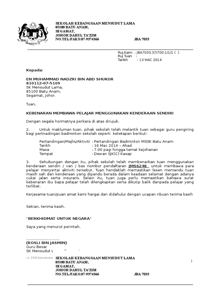 Surat Rasmi Permohonan Menggunakan Kenderaan from static.fdokumen.site Please fill this form, we will try to respond as soon as possible. Terkadang ada banyak hal disaat kita bekerja di sebuah perusahaan atau instansi yang membuat. Dalam membuat surat penawaran berikut inti utama yang perlu diperhatikan. Ada apa dalam set contoh surat kebenaran bawa kenderaan? Format gambar contoh surat kebenaran guna kenderaan terbaik 2019. Norilawati binti ibrahim, 68a kampung sawa besar, 06700 pendang, kedah tuan/ puan, memberi kebenaran menggunakan kenderaan berhubung perkara di atas, saya seperti nama yang tertera di atas, ingin mengesahkan kebenaran saya kepada. Contoh surat kebenaran ibu bapa auto prima college no.23 jalan kemuning prima b no tel : Ini syarat dan cara membuat surat domisili.