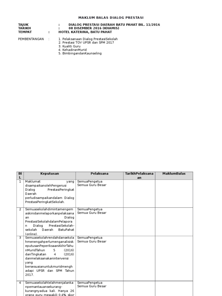 Dialog Prestasi Sekolah Pptx from imgv2-2-f.scribdassets.com Satu program dialog prestasi linus tahun 3 (2013) akan diadakan pada ketetapan berikut : Program selesai jam 1.30 petang. Berikut dilampirkan surat panggilan dan tapak pembentangan untuk dilengkapkan. Mengenal pasti masalah, punca dan intervensi sekolah dalam menyelesaikan masalah yang dibangkitkan dalam dialog prestasi sekolah. Perbincangan untuk program gabungan 4 buah sekolah. Faktor campur tangan british di tanah melayu; Dialog prestasi bersama ibu bapa pelajar cemerlang. Dialog prestasi daerah batu pahat bil.5/2016 dengan segala hormatnya perkara di atas dirujuk.